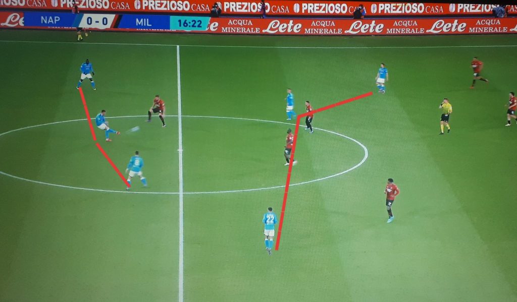 Ma ad oggi, qual è il piano tattico del Napoli? Quali sono i fili che muovono la fase offensiva degli azzurri? Guai all’imprevedibilità, si gioca sempre a squadra schierata. Mario Rui occupa una posizione interna, mentre Di Lorenzo si sgancia dalla linea difensiva per stazionare sull’esterno di centrocampo. Dei due mediani, quello mancino diventa il vertice e il riferimento centrale, quello da cui devono transitare tutti i palloni da smistare; quello destro, invece, spesso scivola sull’esterno ad occupare il vuoto lasciato da Di Lorenzo. Di fatto, ci sono due linee da tre ed una da quattro, composta dai due esterni, Zielinski ed Osimhen.
