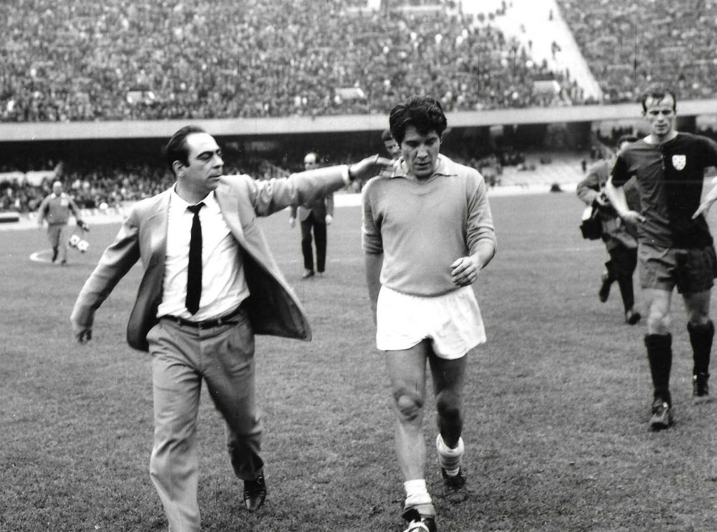 Albertosi è un signor portiere, Cera è stato riscoperto libero e regista difensivo, Martiradonna e Zignoli (quel giorno al posto di Mancin) sono due terzini rocciosi ma che sanno anche attaccare, Tomasini un elegante centrale, Niccolai è un ottimo stopper ma, ahimè, è famoso per i suoi autogol e l’attacco ha Domenghini, Nenè, Gori, Greatti e Riva. Così, snocciolati come un rosario. A guidare quella squadra c’è lui, Manlio Scopigno detto il Filosofo. Era alto, dall’aria disincantata, sembrava un incrocio tra un attore di film muti ed un patrizio romano coi suoi riccioli e la frangetta. Magro, i capelli corti ma già brizzolati, lo sguardo pensoso e il volto scavato dal fumo, pareva un console di un’antica civiltà ma era friulano. Silenzioso come un vero ‘furlan’, pigro come un romano.