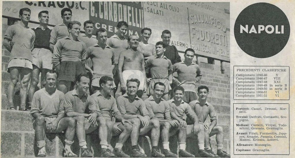 Manlio Scopigno nacque a Paularo (UD) nel 1925 e morì a Rieti nel 1993. Giocò nel Rieti, nella Salernitana, nel Napoli 1951/52, mettendo a referto 6 presenze ed un gol (nella famosa Napoli Como 7 a 1 del maggio 1952,) e in quello 1952/3 – una sola presenza. Con gli azzurri non ebbe fortuna poichè era chiuso da difensori quali Delfrati, Comaschi, Vinyei, Granata, Castelli e Gramaglia, una squadra forte che oscillava tra il quarto ed il sesto posto e che contava un super portiere come Casari, Kriezu e Amadei, poi Jeppson e Pesaola, Vitali e Todeschini.